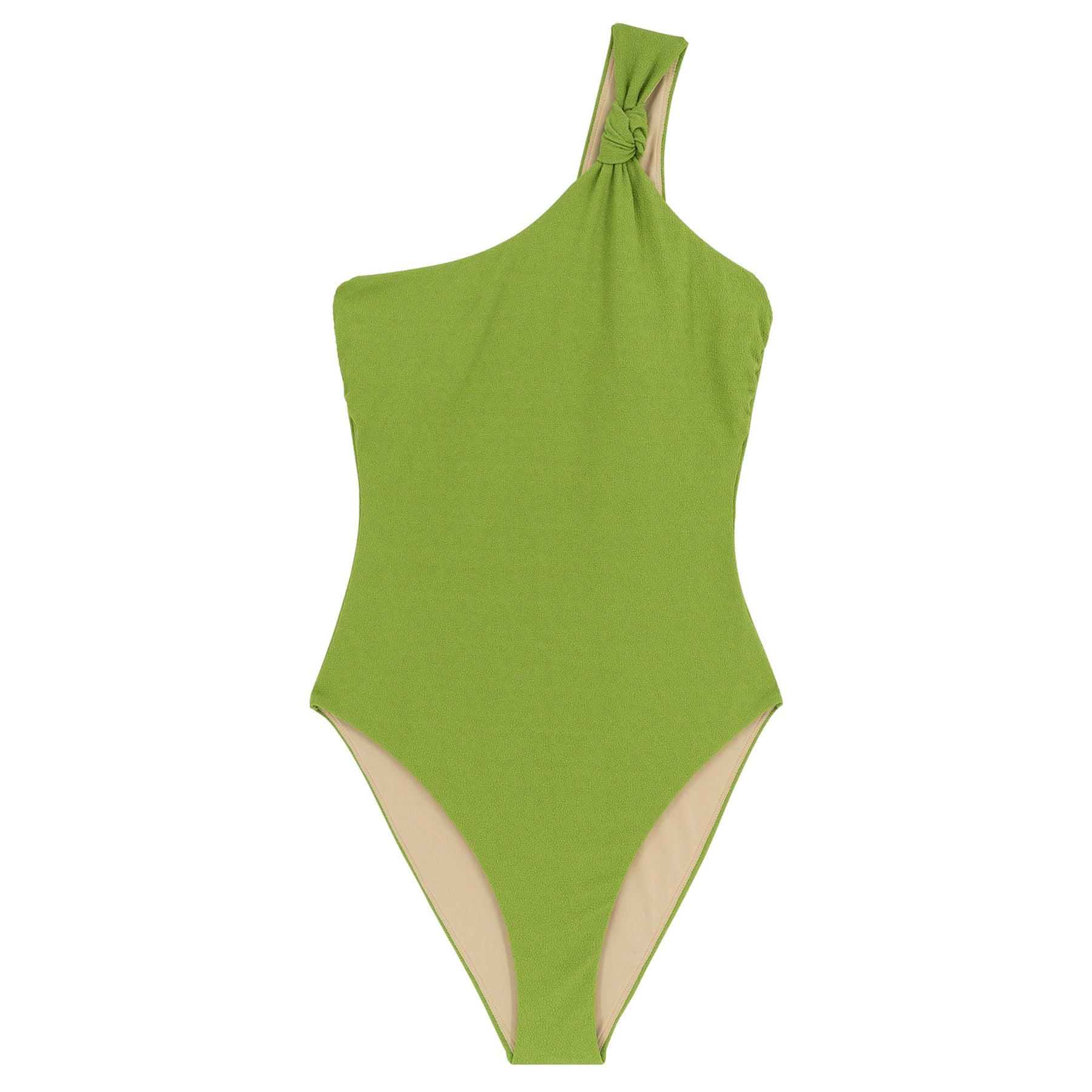 Vår Sacha-badedrakt i grønt er laget av myk, resirkulert polyester med en vakker teksturert overflate. Designet med én skulder har en stilig knutedetalj og høy benskjæring, noe som skaper et enkelt, men elegant utseende ved bassenget.